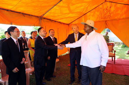 乌干达总统约韦里·卡古塔·穆塞韦尼与集团董事长罗恒亲切握手
