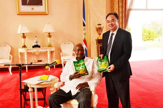 7月19日,乌干达总统穆赛维尼,在总统府会见了科虹集团董事长罗恒、副总裁吴宜东、中乌南南合作专家组长吴志平一行,乌方陪同会见的有乌干达副总统塞坎迪,乌干达农业部长维森特塞匹加、农业部作物司长奥卡塞。总统先生对2016年4月参加过科虹乌干达园区奠基仪式的事还历历在目。会上,罗恒董事长向总统先生展示了园区自己生产的小米,总统先生高度赞扬了园区小米的产量与品质,罗恒董事长向总统先生表示有意向投资乌干达的水利设施建设、粮食仓储、旅游业等,总统先生表示欢迎并详细介绍了乌干达相关行业的情况。期间,总统先生欣然亲笔题字送书给罗恒董事长,对科虹集团在乌干达的投资与支持表示感谢。最后,总统先生还专门向科虹集团总部所在地的四川人民发起邀请,欢迎四川人民来乌干达做客、投资兴业。